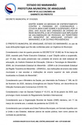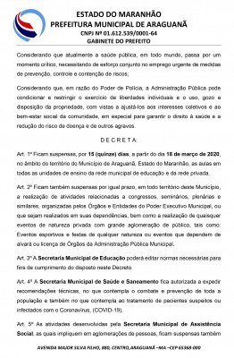 DISPÕE SOBRE AS MEDIDAS DE ENFRENTAMENTO CONTRA A PANDEMIA DO CORONAVÍRUS – COVID19, BEM COMO SOBRE A SUSPENSÃO, POR 15 DIAS, DAS AULAS NAS UNIDADES DE ENSINO DA REDE MUNICIPAL E DE ATIVIDADES QUE IMPLIQUEM NA AGLOMERAÇÃO DE PESSOAS, NO TERRITÓRIO DO MUNICÍPIO DE ARAGUANÃ, ESTADO DO MARANHÃO, E DÁ OUTRAS PROVIDÊNCIAS.