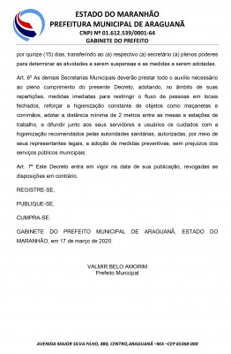 GABINETE DO PREFEITO MUNICIPAL DE ARAGUANÃ, ESTADO DO MARANHÃO, em 17 de março de 2020.